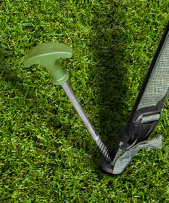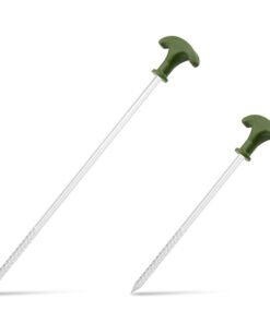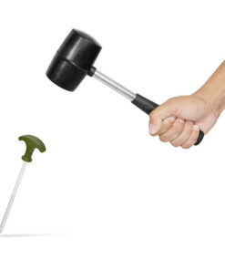 Die Stifte haben vollständig geschlossene grüne Kunststoffköpfe, die den Vorteil haben, dass sie sich auch nach dem längeren Einschlagen in den Boden nicht lockern und das Metallteil nicht nach unten rutscht. Ein Bohrer mit einer robusten Vierkantspitze erleichtert das Einschlagen in den harten, trockenen Boden. Die Zacken sind beim Kauf mit den transparenten Schutzkappen versehen, die für die zusätzliche Sicherheit sorgen. Zum Lieferumfang gehört auch ein Gummihammer mit dem Metallfuß und dem schwarzen Gummigriff, der das Einschlagen der Stifte in den Boden erleichtert.